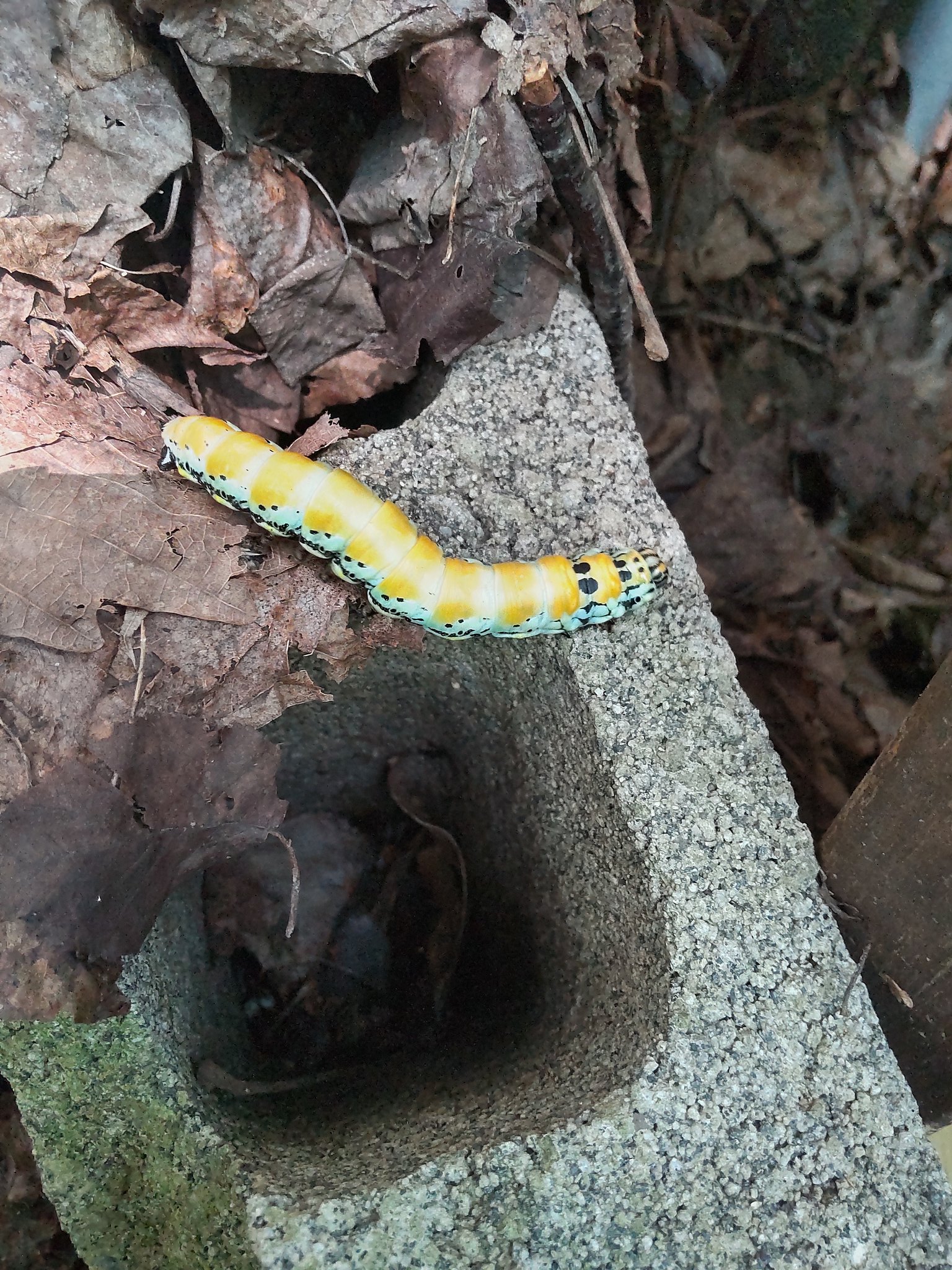 調べたらイボタガの終齢幼虫で、ここから土に潜って蛹化し、来春羽化するのだそうな。英名はフクロウ蛾で、フクロウを擬態したような大型の蛾なのだそうです。君にまた会えるのは来春かー。成虫の姿を見てみたいものですな。