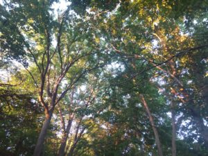 朝日に照らされる裏庭の木々。