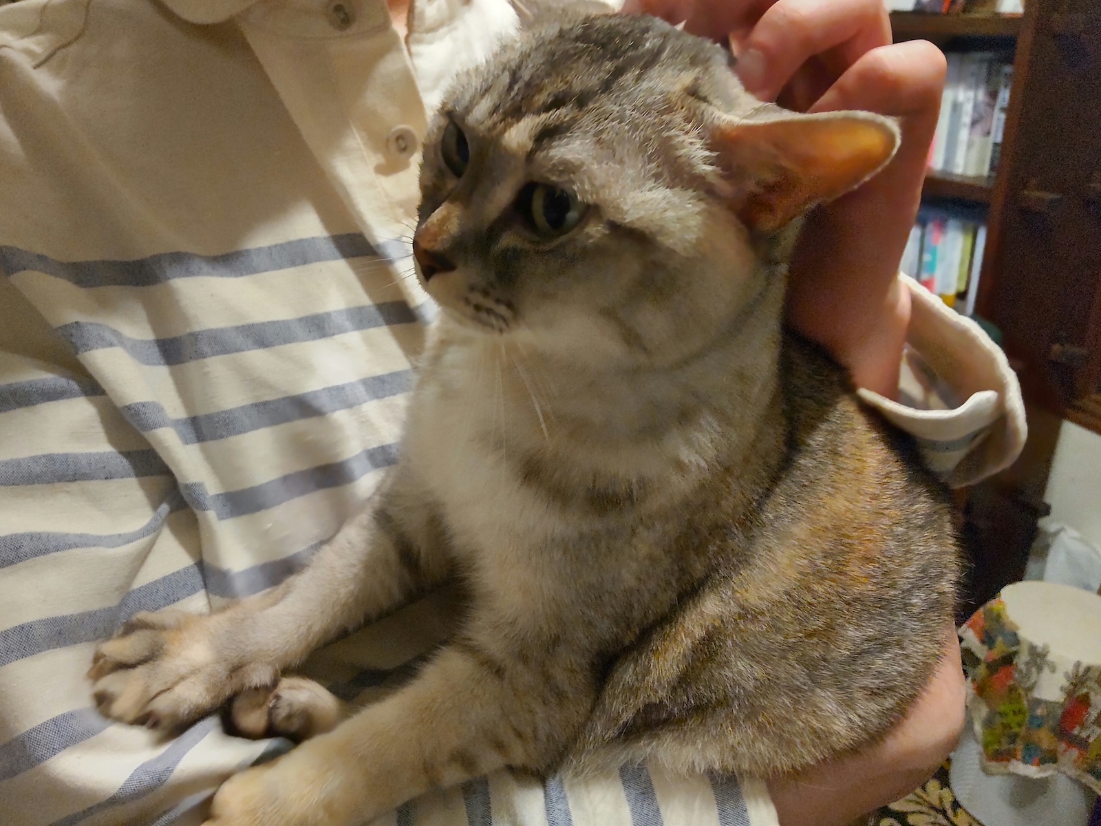 ビビりなもので微妙な表情ながらも、大人しく腕の中にいて成長を感じる…。